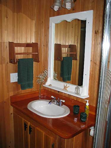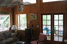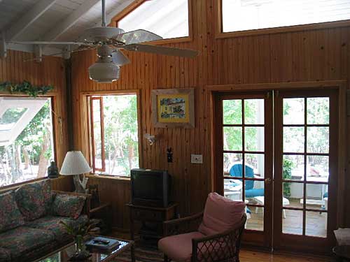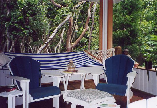 Laze away the afternoon on the screened porch in a hammock and enjoy the hummingbird feeders, birdbath and wild orchids. Our wrap around deck has an outside shower and gas BBQ grill. This deck leads to a upper deck with a magnificent view of Sea of Abaco and surrounding islands. Great for sun tanning and stargazing! |